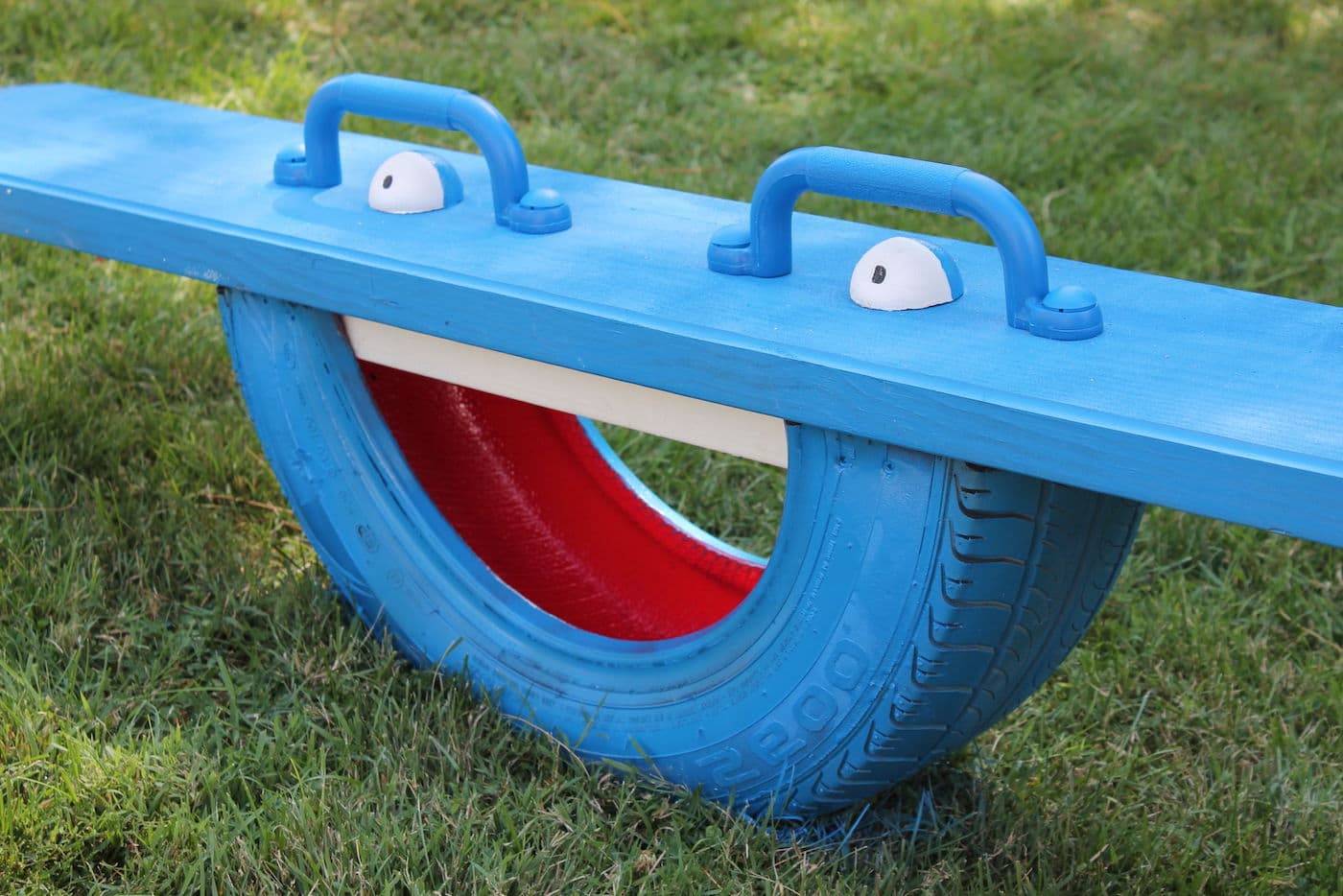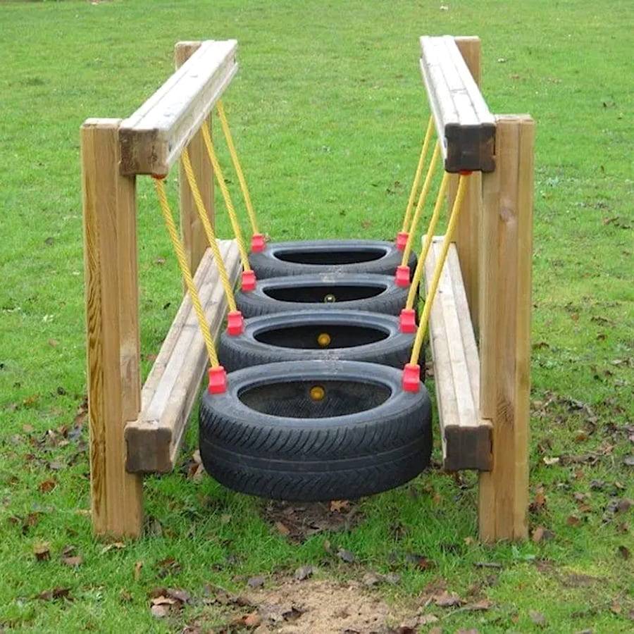 Создавая качели, пользуются стареньким скейтбордом, подвязанным за верёвки, продетые в просверленные отверстия. Маленького ребёнка устроит вариант из покрышки. Вырезая два боковых кольца, оставляют вместительное днище и выворачивают резину наизнанку.