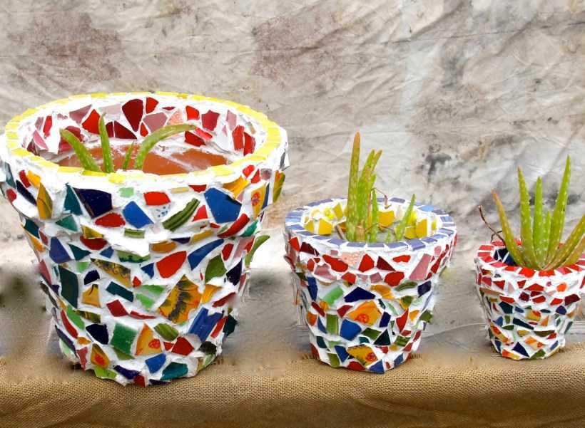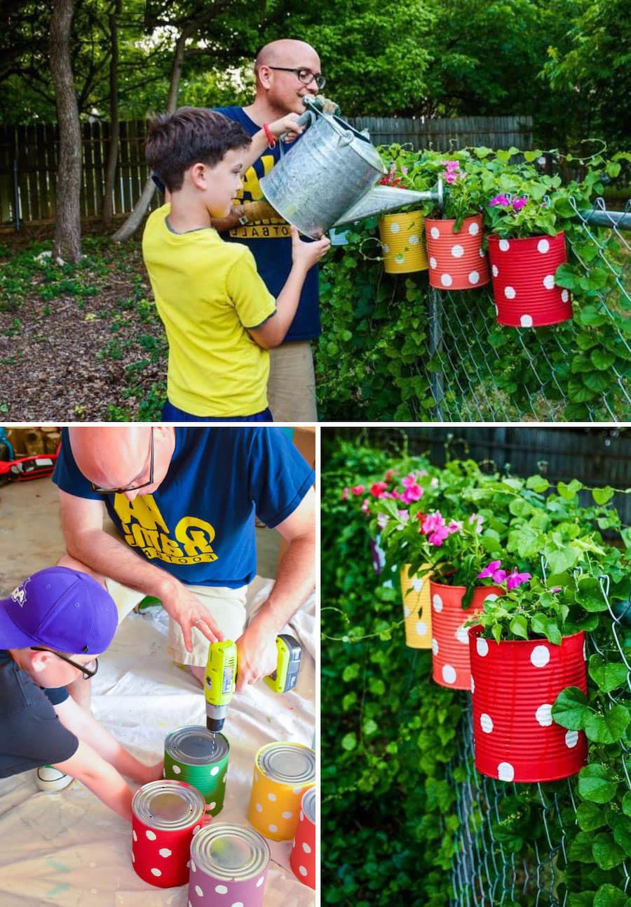 Небольшие ведерки из-под майонеза, различные банки украшают бусинами, ракушками или другим декором. Их несложно расписать, покрыв затем лаком. Наполняют почвой и высаживают любимые цветы. Из таких небольших деталей легко собирается вертикальная композиция, украшающая стены беседки, забор.
