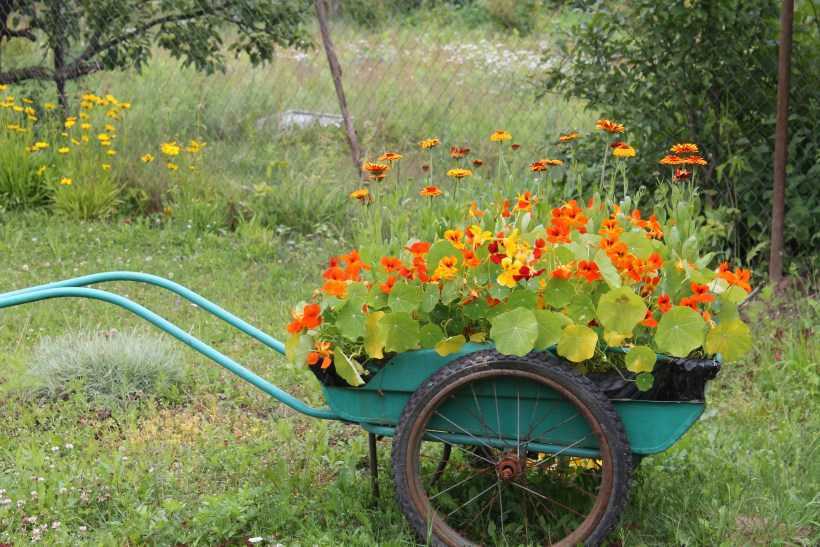 Старая, покосившаяся тачка также может стать креативным декором дачного участка. Подберите для нее подходящее место и поставьте внутрь горшки с цветами.