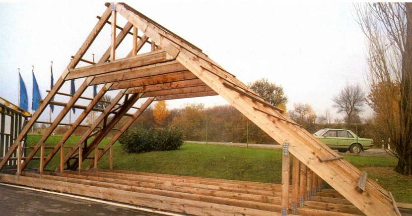 Если ширина пролета составляет от 4,5 до 6 метров, то стропила нужно усилить раскосами (наклонными стойками из бруса). Они уменьшат прогиб стропильных ног под действием снеговой нагрузки. Нижние концы раскосов заделывают в кладку, а при использовании вертикальных опорных стоек крепят к ним при помощи скоб, гвоздей или зубчатых металлических пластин.