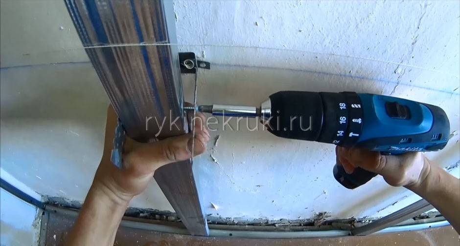 Поэтому важно, чтобы остальные профили не касались и не оттягивали нитку. Для этого мы берем два самореза, надавливаем на профиль и вставляем их в боковые отверстия в П-образном подвесе для фиксации профиля, чтобы профиль не доставал нитку:. Таким образом и следующие профили: