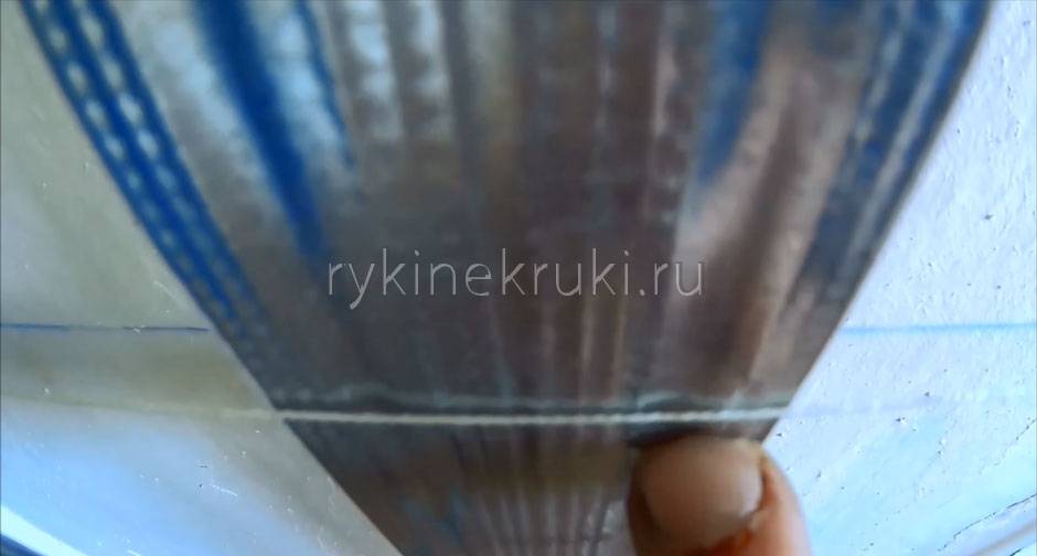 Сейчас все профили, предшествующие первому профилю придавлены к стене. Начинаем выставление первого профиля. Профиль не должен ни в коем случае отгибать нитку:
