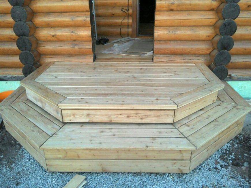 В условиях постоянной влажности пиломатериалы дополнительно обрабатываются антисептиками и красящими веществами, обладающими защитными свойствами для древесного полотна от излишней влаги. Площадка перед самой входной дверью укладывается на несколько сантиметров ниже уровня дверного проема, иначе из-за разбухшей древесины вы не сможете открыть дверь после выпавших осадков.