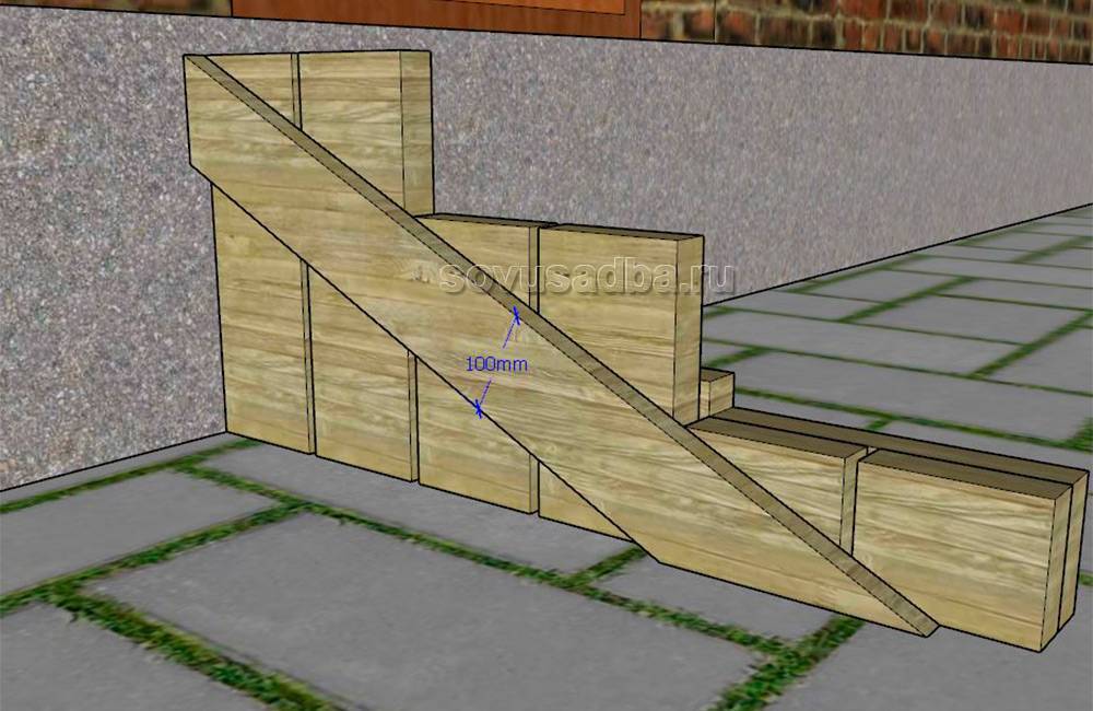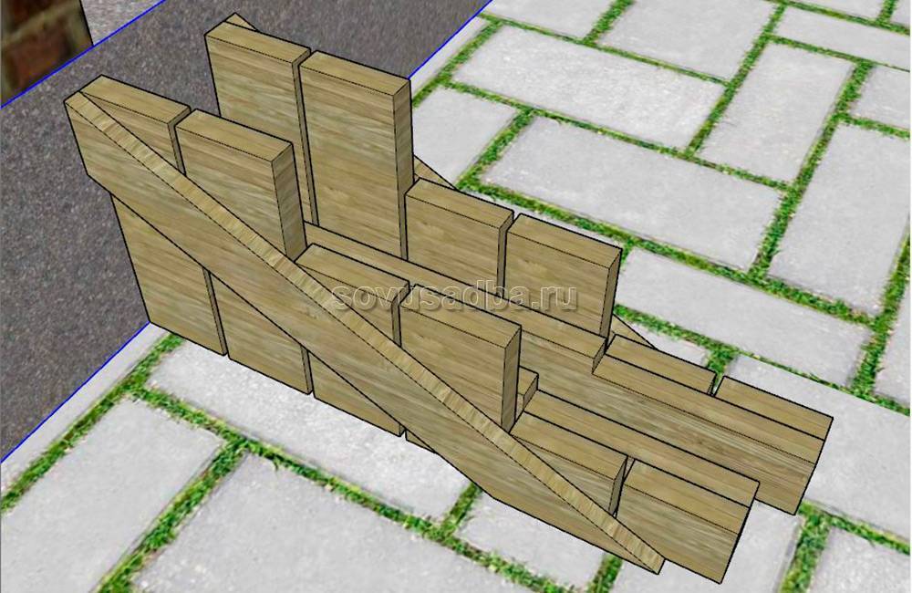 - обязательно подготовьте и сразу закрепите на опалубке распорки – они предотвратят деформацию дерева и обеспечат безупречно ровные ступеньки после высыхания цементного раствора;