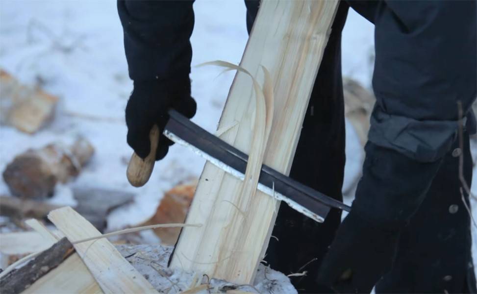- Одной рукой ведут лезвие вдоль чурбака, другой отрывают слой волокон от массива.