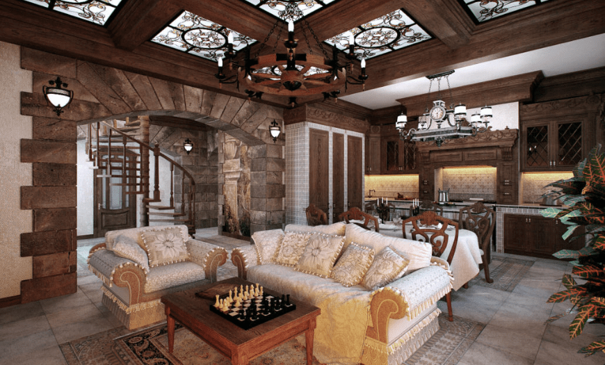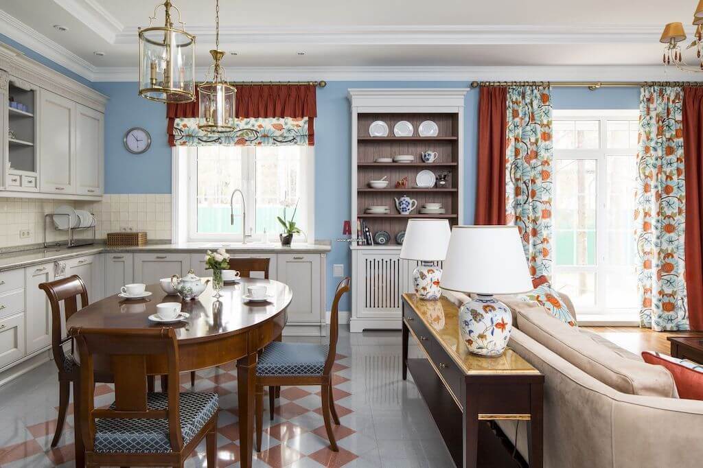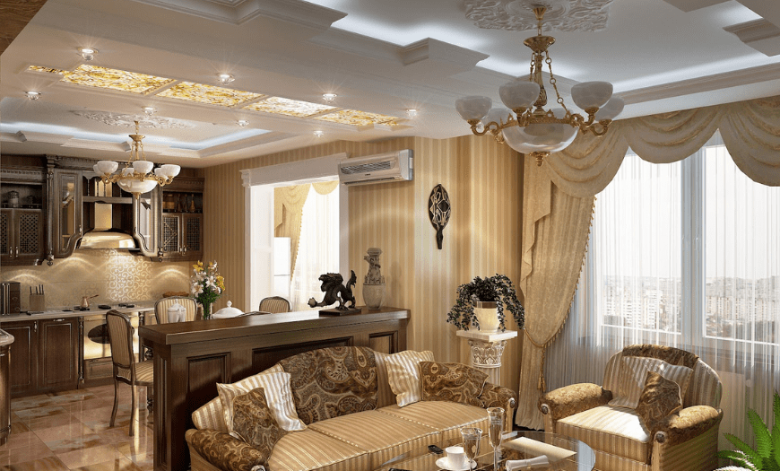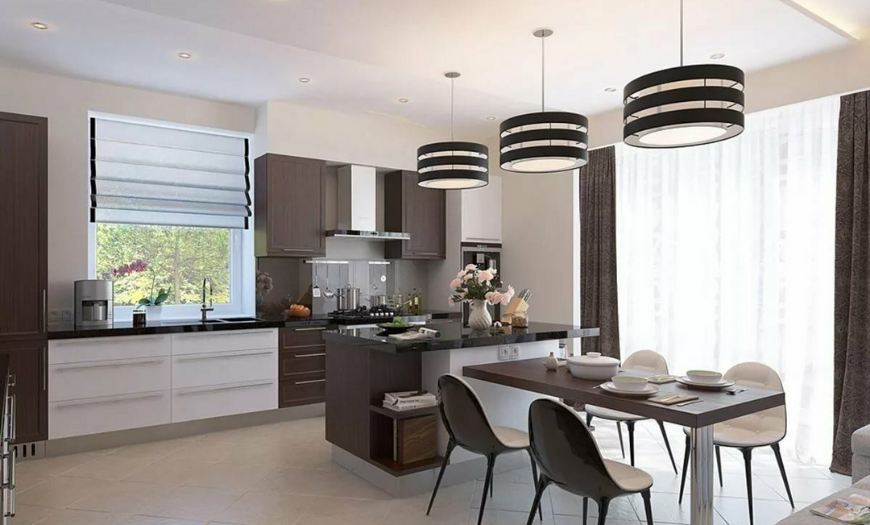В дизайне кухни гостиной в доме с большими параметрами крайне важны аксессуары, «смягчающие» интерьер. Длинные классические шторки, скатерти, коврики, эффектные светильники отлично справятся с этой задачей.