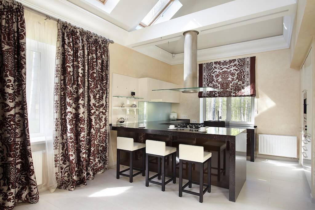 классические — самые привычные гардины из всех перечисленных. Впишутся в любой интерьер, при правильно подобранном варианте всегда будут смотреться модно и стильно. Используют различные виды ткани — от синтетики до шелка, что позволяет вписать в абсолютно любой дизайн. Длинные классические шторы не рекомендуется использовать на маленькой кухне, поскольку они занимают и без того небольшое пространство. Еще один повод отказаться от длинных занавесок — летящая грязь и тепло от нагревательных приборов, из-за которого может возникнуть возгорание;