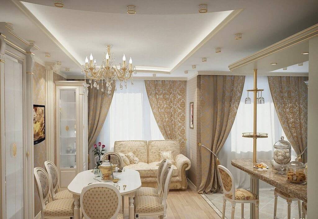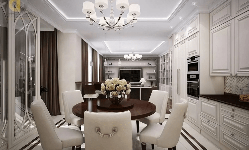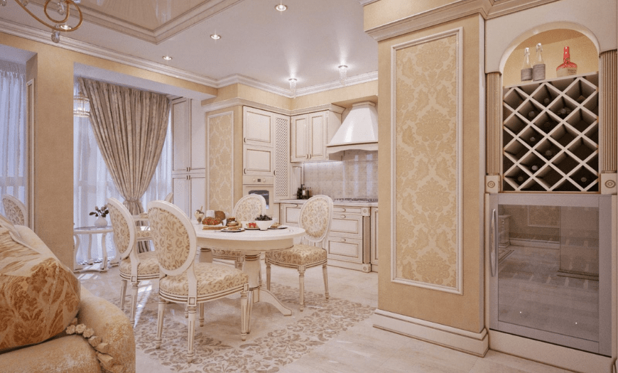 Неоклассицизм предполагает старое, но в новой интерпретации. Преобладают светлые оттенки и простота, доминирует классическое оформление дизайна, нет загруженности мебелью и техникой.