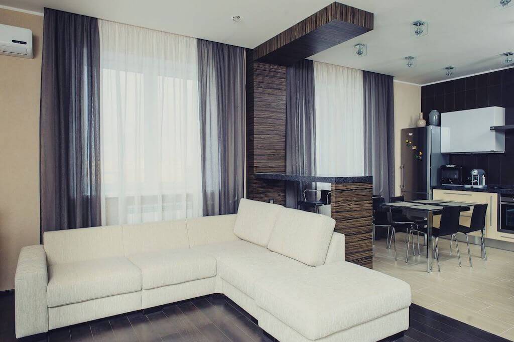 Если не хочется лишних перегородок, то приоритетнее зонирование мебелью. Г-образный гарнитур будет наилучшей вариацией разделения зон.