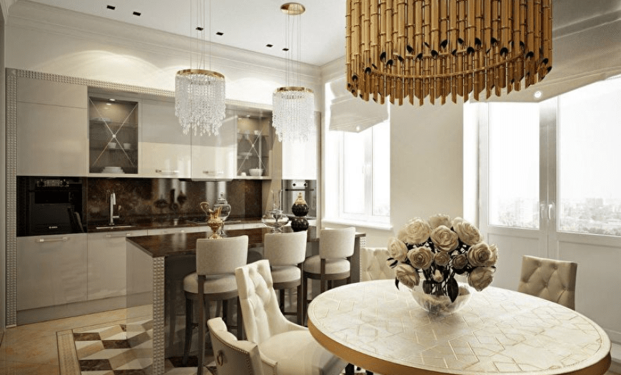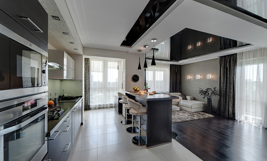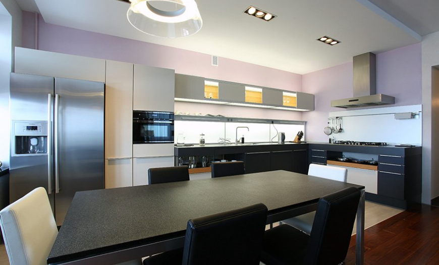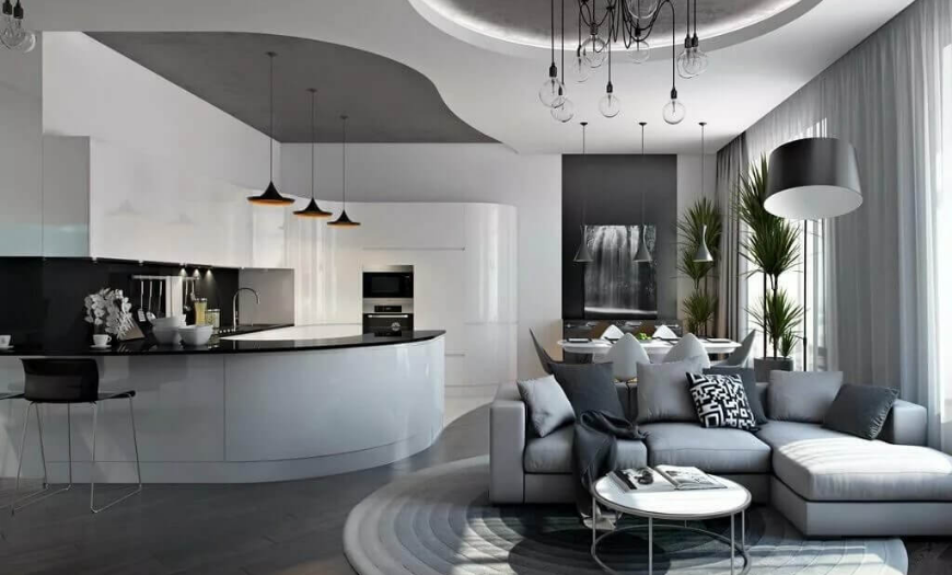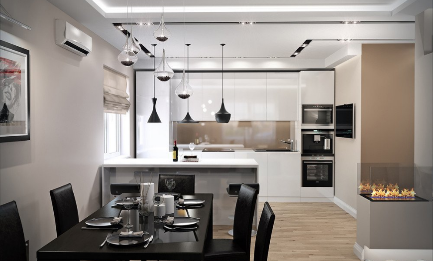 Особенность – акцент по центру помещения. Можно сделать там обеденную группу или диван, а также дополнительное освещение. В таком дизайне актуально будет смотреться ступенчатый потолок, мраморный пол, фартук черно-белого окраса и стулья в форме геометрических фигур.