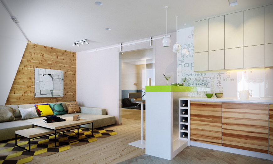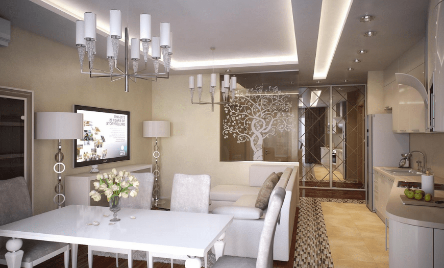 Разделяя пространство на зоны, применяют различные приемы. В основном месте перехода двух зон в качестве разделения будут уместны: