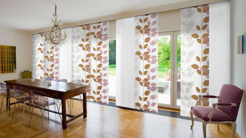 японские — представляют собой тонкие (50–100 см) и длинные (до пола) полосы ткани. Из-за формы их часто называют японскими панелями или экранами. Сверху и иногда снизу закреплены на рельсы, как дверцы у шкафа-купе, что позволяет использовать шторы не только для оформления окна, но и для зонирования пространства и отделения рабочей и обеденной зоны;