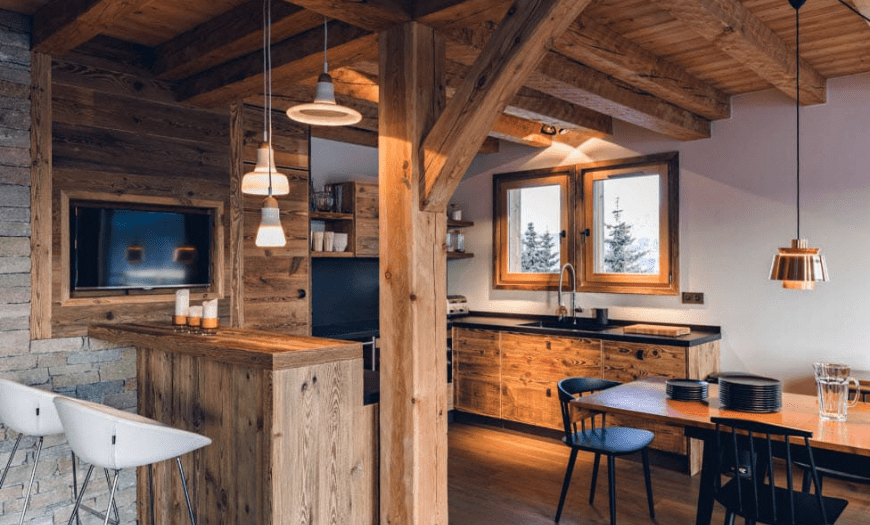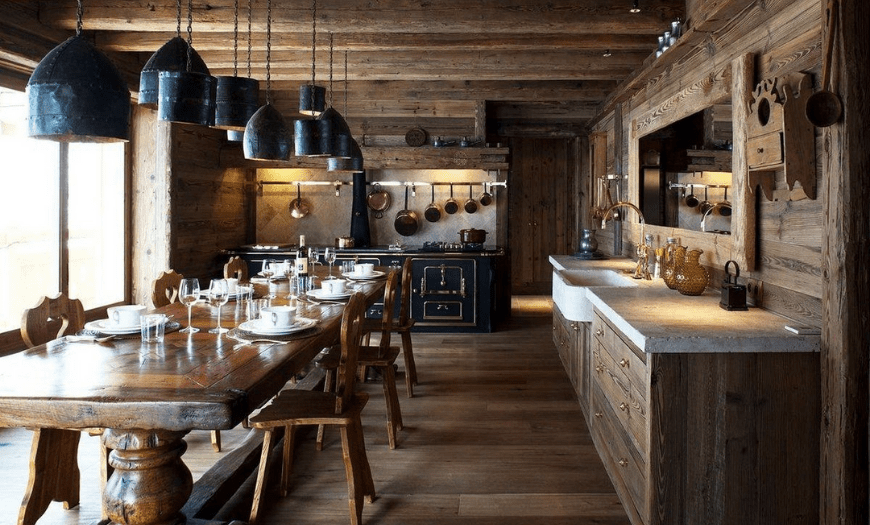 | Рустик | Относительно новый вид, который считают самым природным. Дерево используется в необработанном виде, много камня и грубых поверхностей. Рустик максимально приближен к кантри, но больше подходит любителям природы и охоты. Не используется: роскошная утварь, яркие цвета, орнаменты. |