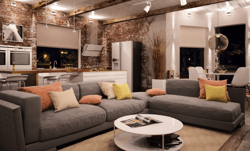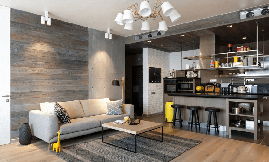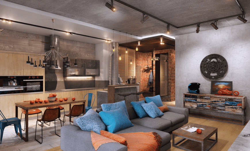 Идеален для объединенной кухни-гостиной. Не нужно скрывать технические элементы, например, кирпичную кладку. Стиль предполагает неоднородные поверхности, вдоль которых струится свет, создавая объемные тени.