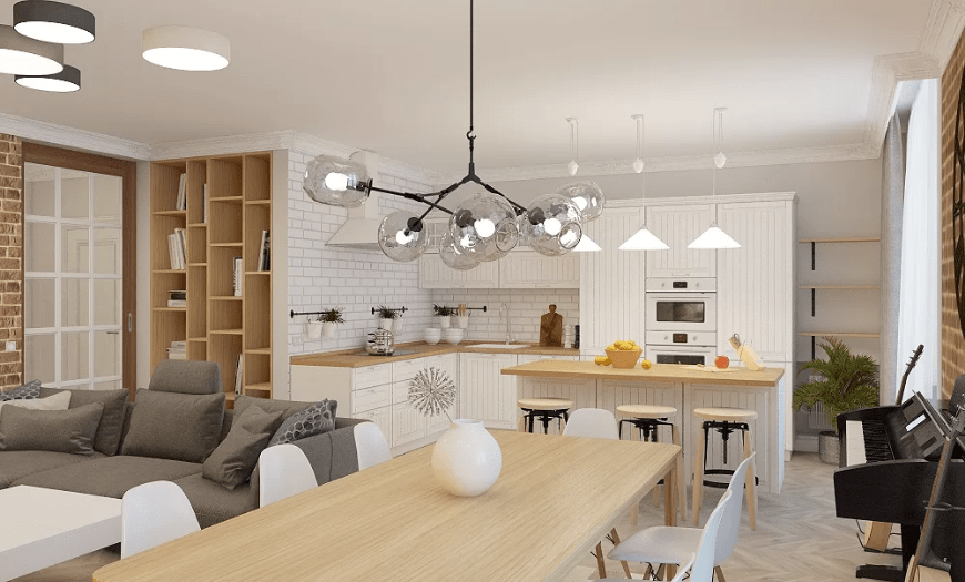 Планировка, дизайн и интерьер кухни совмещенной с гостиной в частном доме должны быть продуманы относительно пропорционального распределения площади.