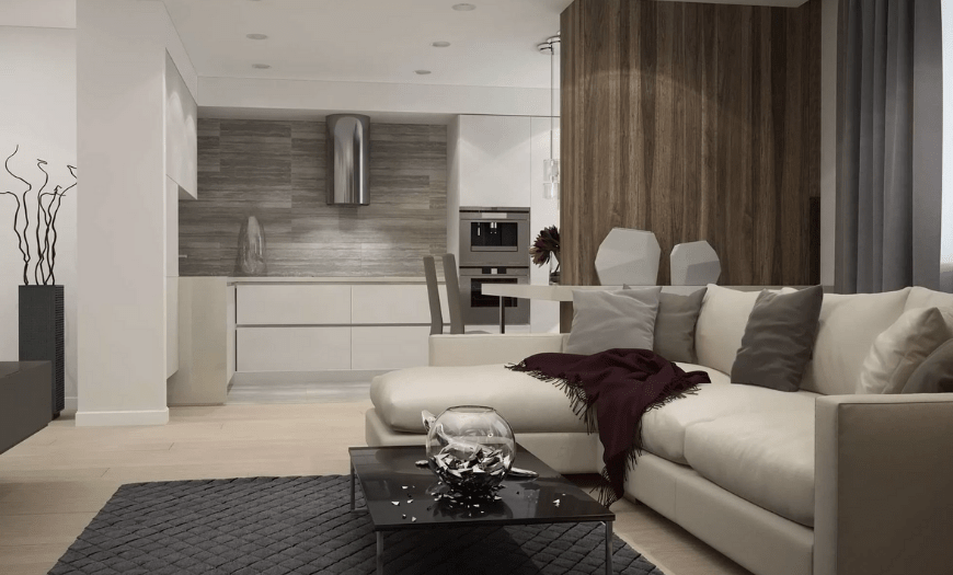 Традиционно элементом зонирования выступает классический диван, разделяющий гостиную и кухню с обеденной группой.