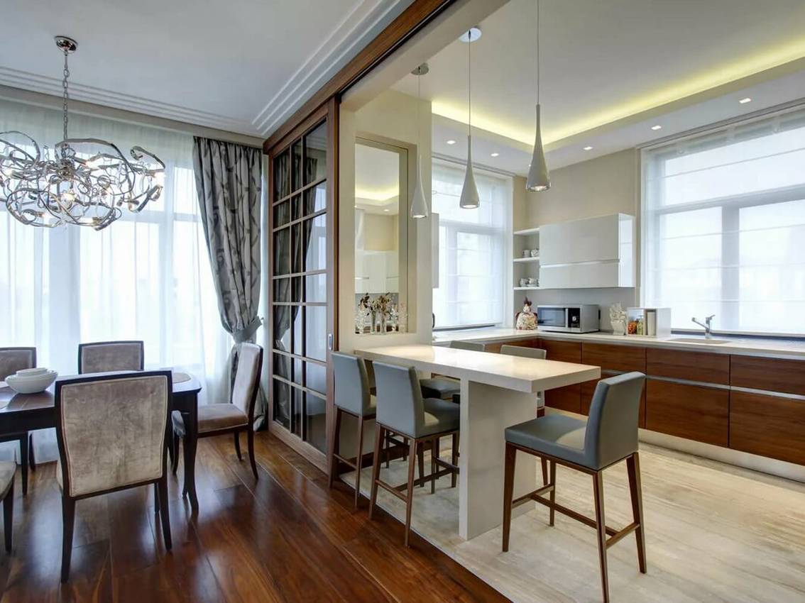 Вариантов совмещения достаточно: кухня-столовая, кухня-гостиная, кухня-гостиная-столовая