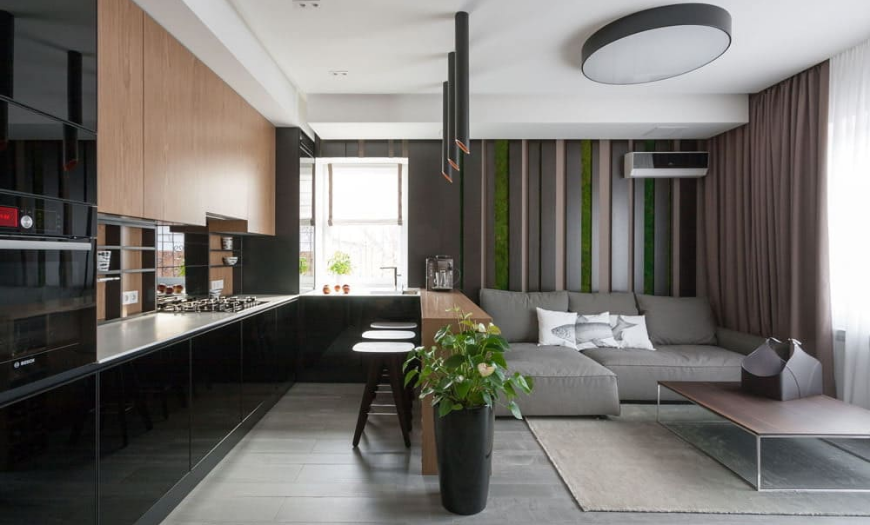 Зона кухни оборудована полуостровным гарнитуром – барная стойка и подвесные светильники над ней участвуют в зонировании пространства.