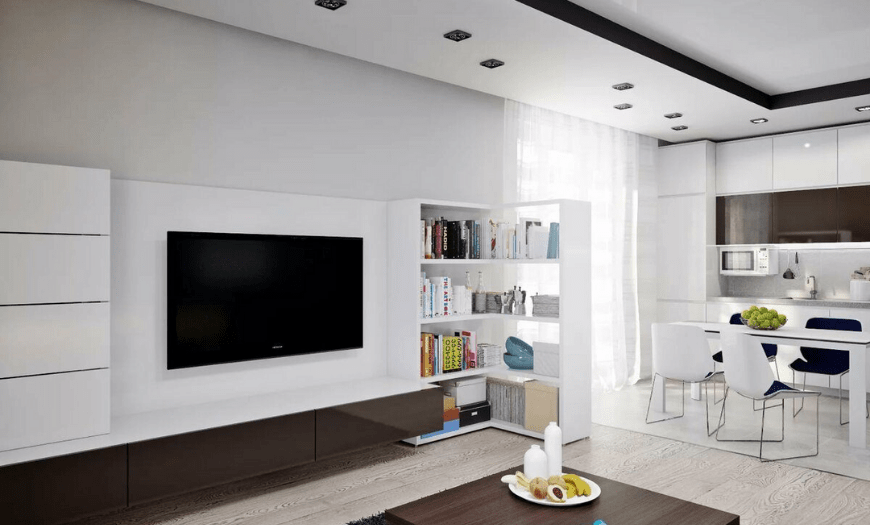 При таком интерьере гостиной, совмещенной с кухней, ведущей становится техника, повсюду экраны, мониторы, сенсоры. Предполагается максимальное удобство и многофункциональность при общем минимализме.