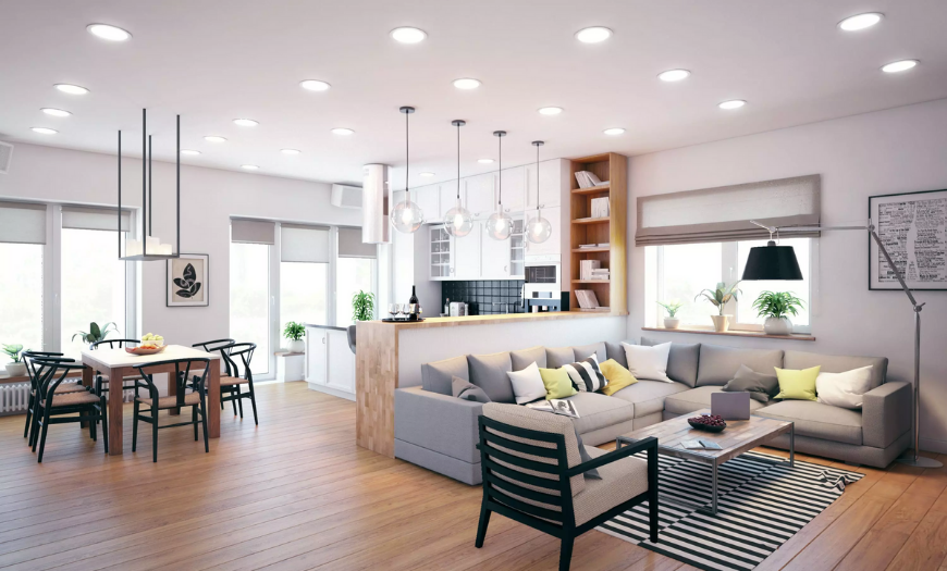 При планировании ремонта в большой комнате с большой функциональной загруженностью вам необходимо будет продумать стиль и цветовую палитру интерьера.