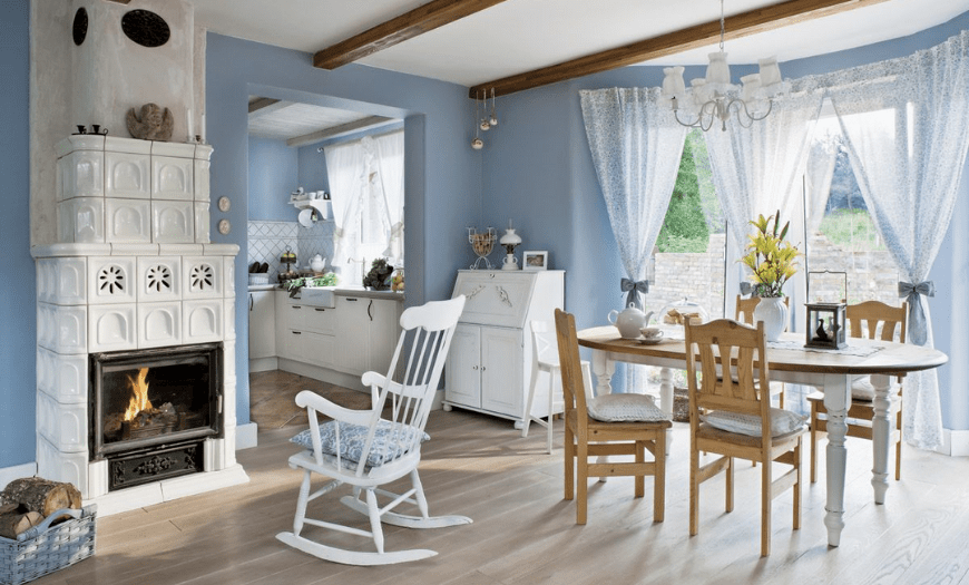 Деревенский дизайн, в котором преобладают светлые и теплые оттенки, классическая мебель, камин и иные интерьерные элементы, создающие вместе уютную домашнюю атмосферу.