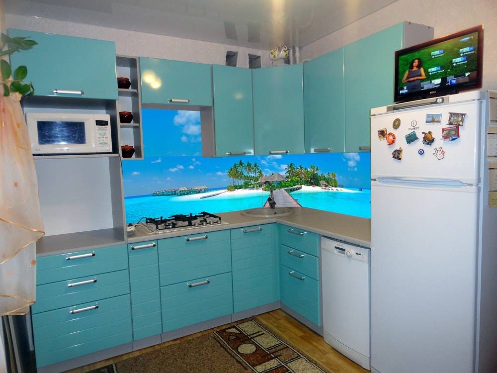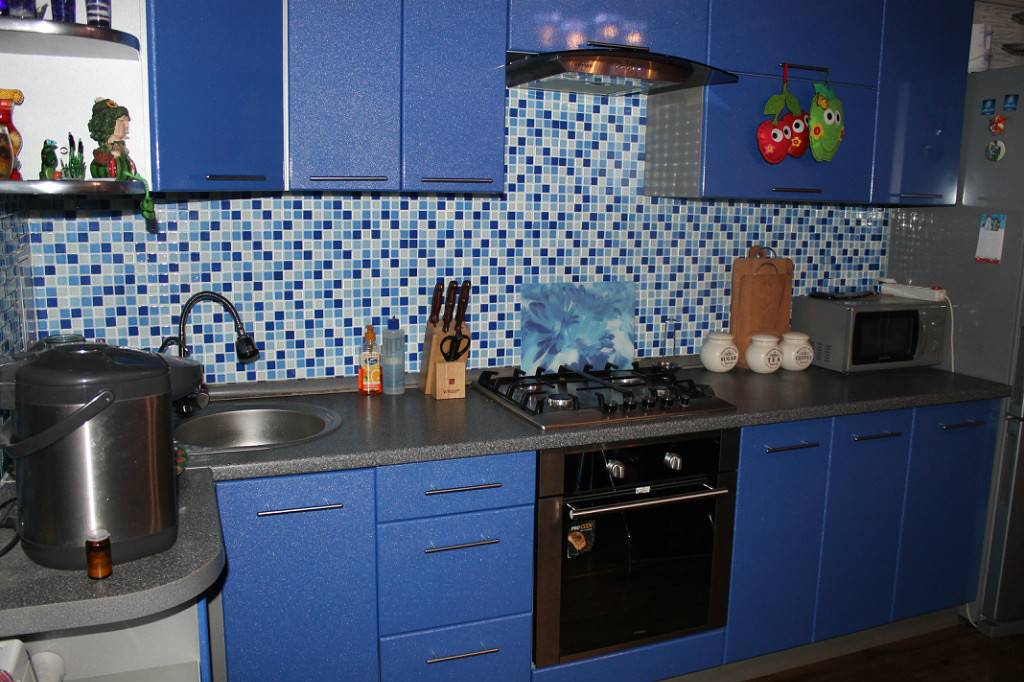 Отлично будет выглядеть мозаика, состоящая из керамических или стеклянных фрагментов в нескольких оттенках синего. Фартук синего цвета будет хорошо сочетаться с рабочей поверхностью белого, серого или черного цвета.