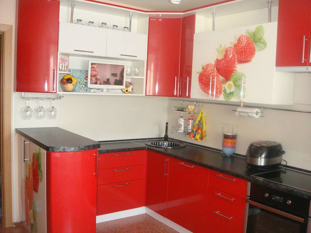 Сам гарнитур можно выполнить в белом, сером или синем цвете, с вкраплениями красных элементов. Для обустройства столешницы в красном цвете можно использовать такие материалы, как натуральное дерево, пластик, синтетический либо натуральный камень, стекло.