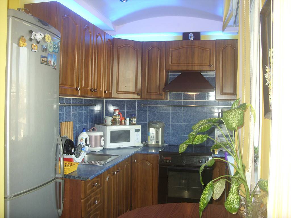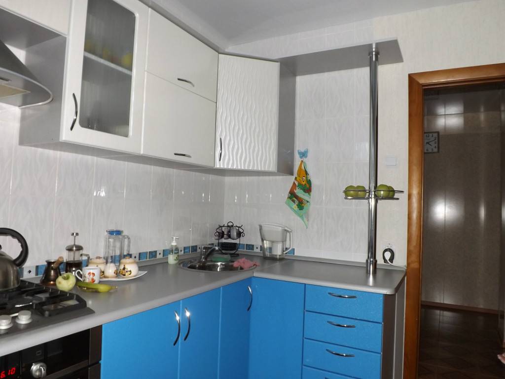 Кухня в светло-синих (голубых) тонах — такие оттенки подходят для обустройства помещений любых размеров. В светло-голубые тона можно покрасить стены на кухне, подобрать гарнитур с фасадами лазурных оттенков. Пол можно сделать керамическим, либо постелить ламинат, лучшим оттенком для него станет цвет натурального светлого дерева.