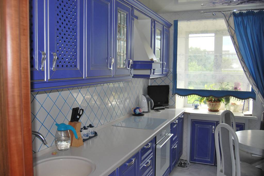 В классическом интерьере гарнитур синего цвета можно встретить нечасто. Применять подобный оттенок можно при обустройстве кухни в стиле кантри — однако он должен быть приглушенным и тусклым. В синем цвете можно выполнить столешницы, кухонный фартук и подобрать в тон шторы.