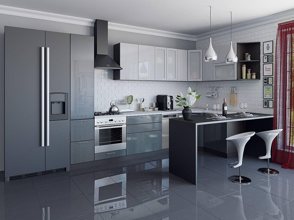 Когда речь идет о создании ультрасовременных интерьеров, дизайнеры советуют не боятся применять серебристые оттенки, причем они могут присутствовать не только в виде бытовой техники. Серебристо-серым может быть такой элемент, как фартук, вся фурнитура, декоративные элементы. В общую серо-черную гамму стоит добавить белых и черных тонов.