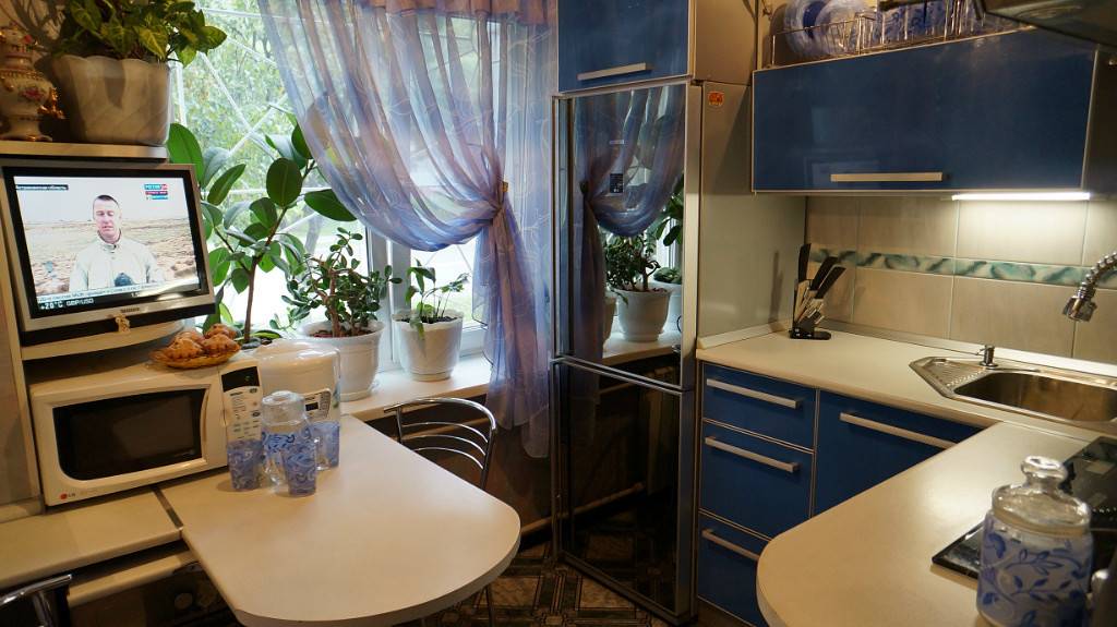 Если на кухне есть большое панорамное окно, его также можно украсить темносиними шторами. Подойдет этот оттенок и для отделки напольного покрытия. На маленькой кухне темно-синей может быть фурнитура, аксессуары, декоративные элементы.