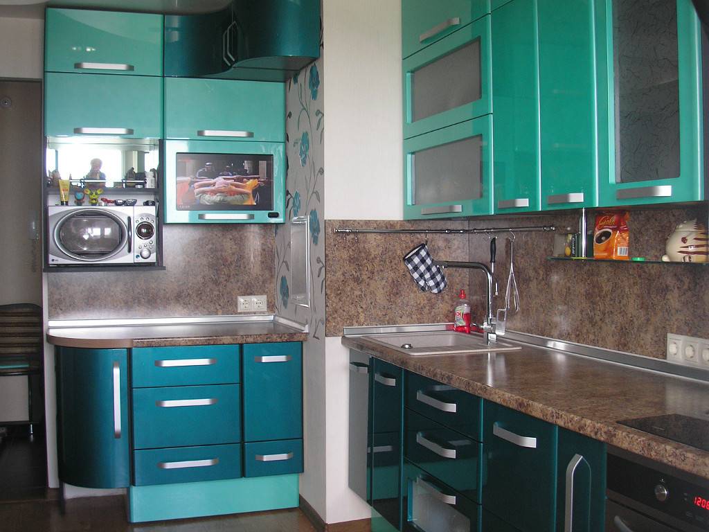 Использовать насыщенные бирюзовые цвета лучше всего в отделке фасадов, кухонного фартука, а также в аксессуарах.