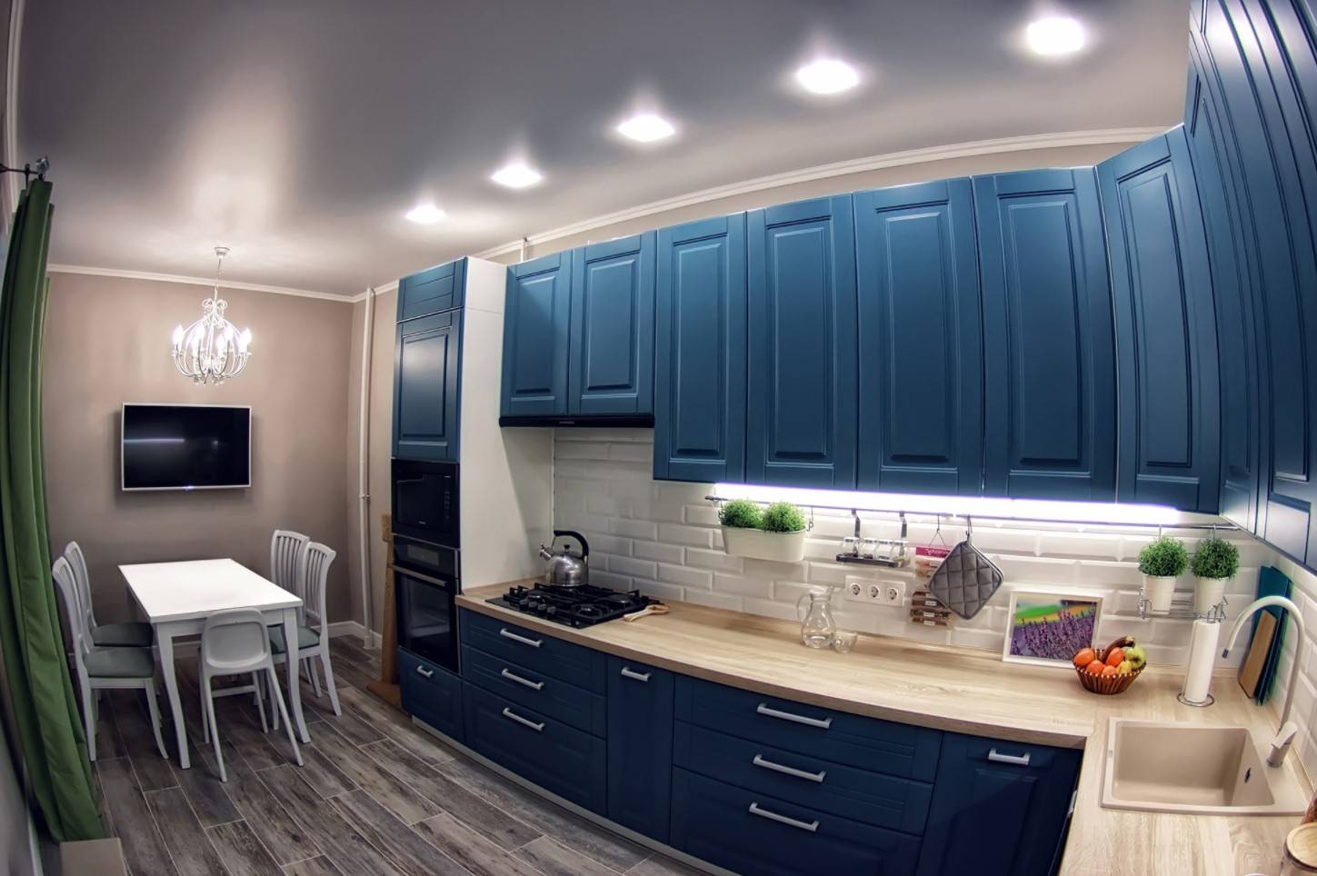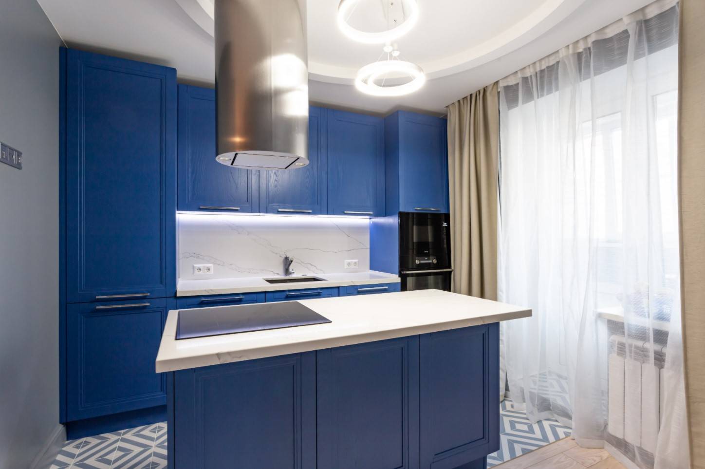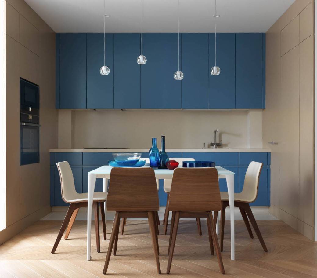 - если полезной площади мало, используйте светлые варианты синевы в качестве фона (стены, потолок, фартук);