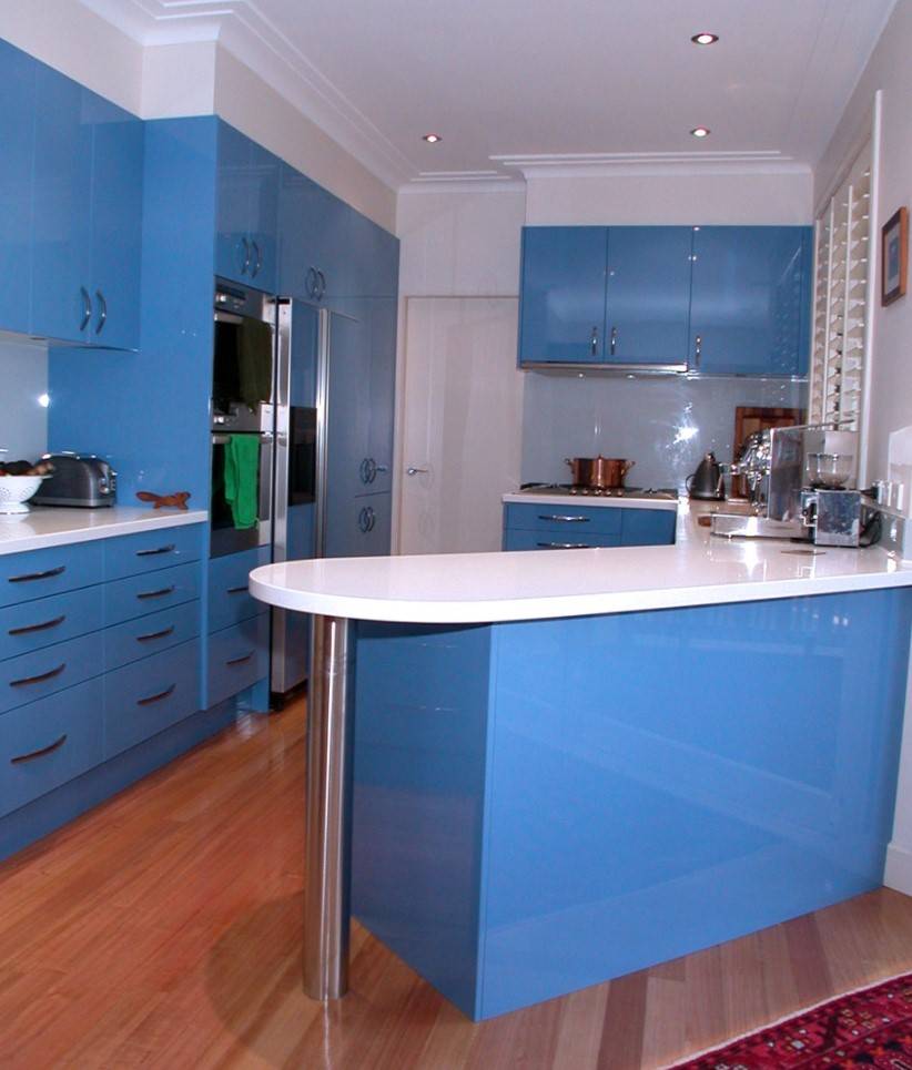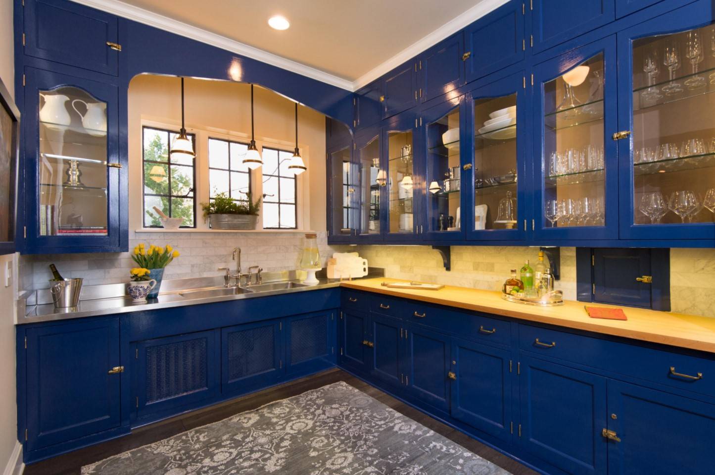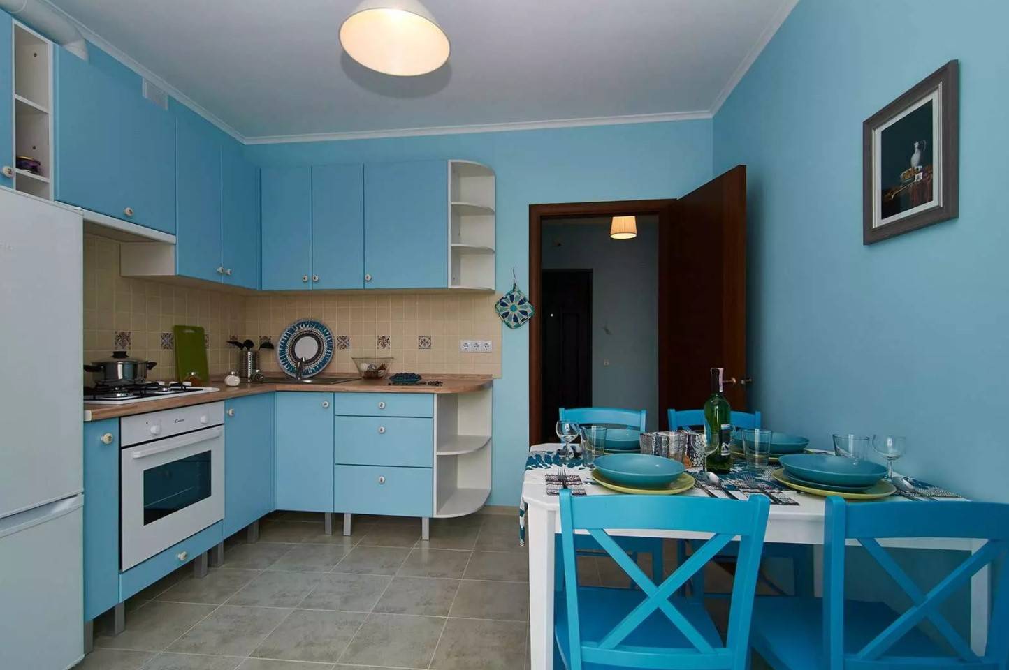 - если полезной площади мало, используйте светлые варианты синевы в качестве фона (стены, потолок, фартук);
