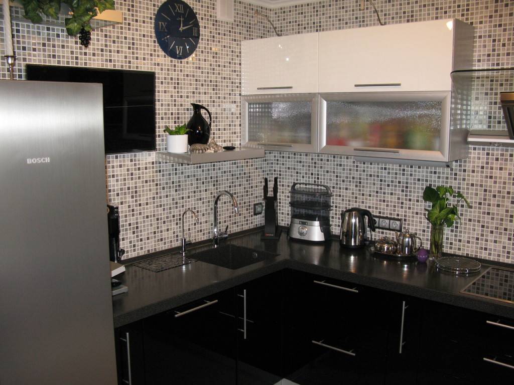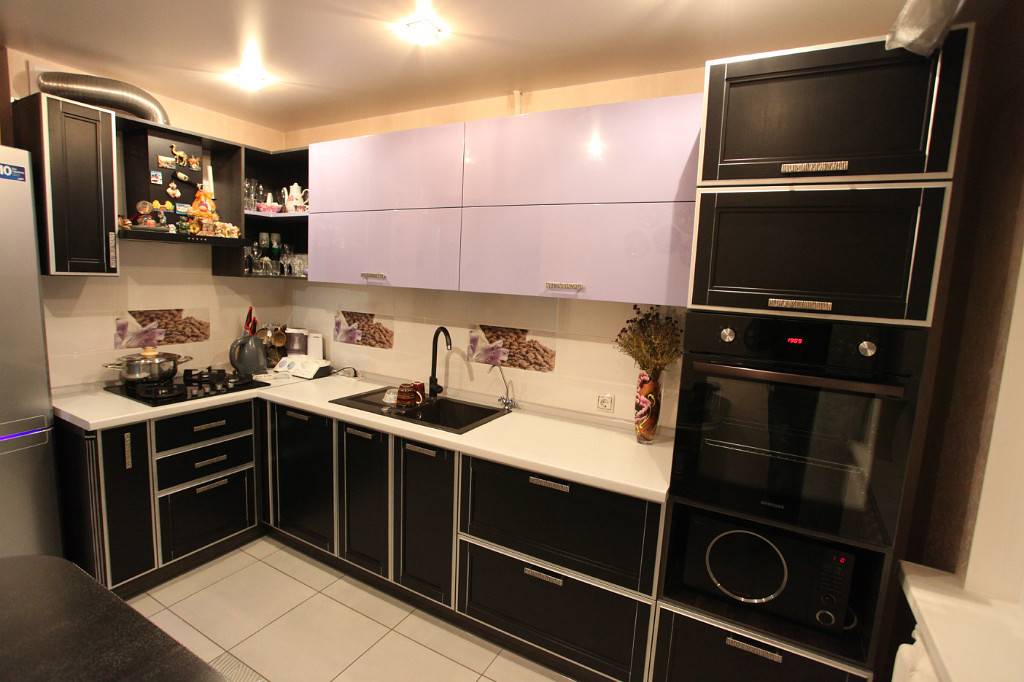 Фиолетовые оттенки считаются модными и способны сбалансировать строгие формы. Необычно смотрится белый фартук с фиолетовым изображением, либо стеклянные вставки на фасаде кухни с фиолетовым принтом. Отделку стен можно выполнить из белой плитки с некрупными фиолетовыми деталями.