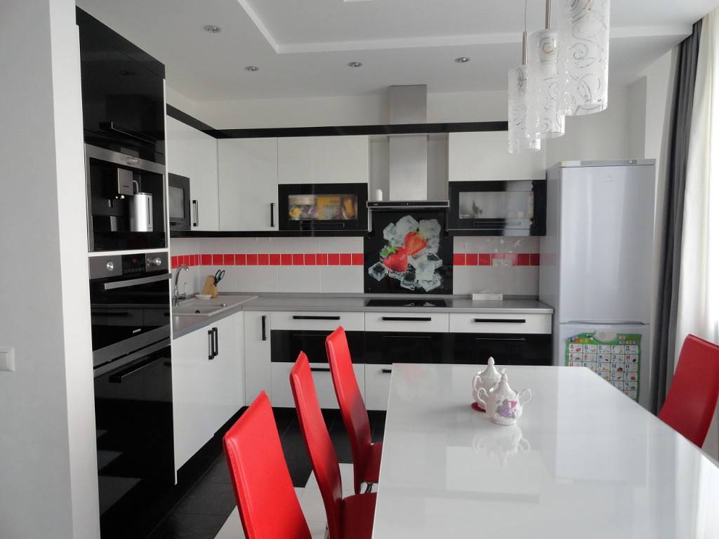 Популярное трио цвета получится при использовании красных оттенков в черно-белой кухне. Он добавит свежести и яркости. Можно использовать его в аксессуарах, например, приобрести красную посуду, расставить красные декоративные элементы, надеть на стулья красные чехлы.