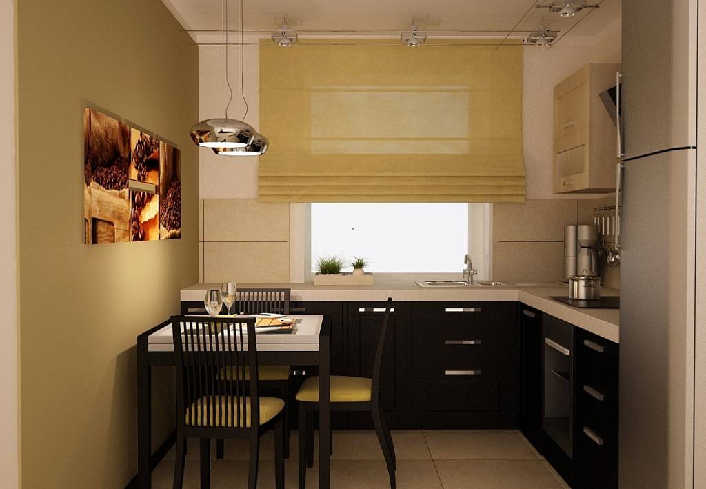 - Имейте в виду, при длительном воздействии обилие желтых красок в дизайне кухни начинает раздражать и утомлять. Поэтому лучше не использовать желтый в интерьере как фон и основу цветовой гаммы. Гораздо гармоничнее он выглядит в виде цветовых акцентов: в декоре, посуде, небольших предметах мебели. Например, чтобы внести нужный импульс энергии в скучное пространство, достаточно повесить на окна желтые шторы как показано на фото ниже.