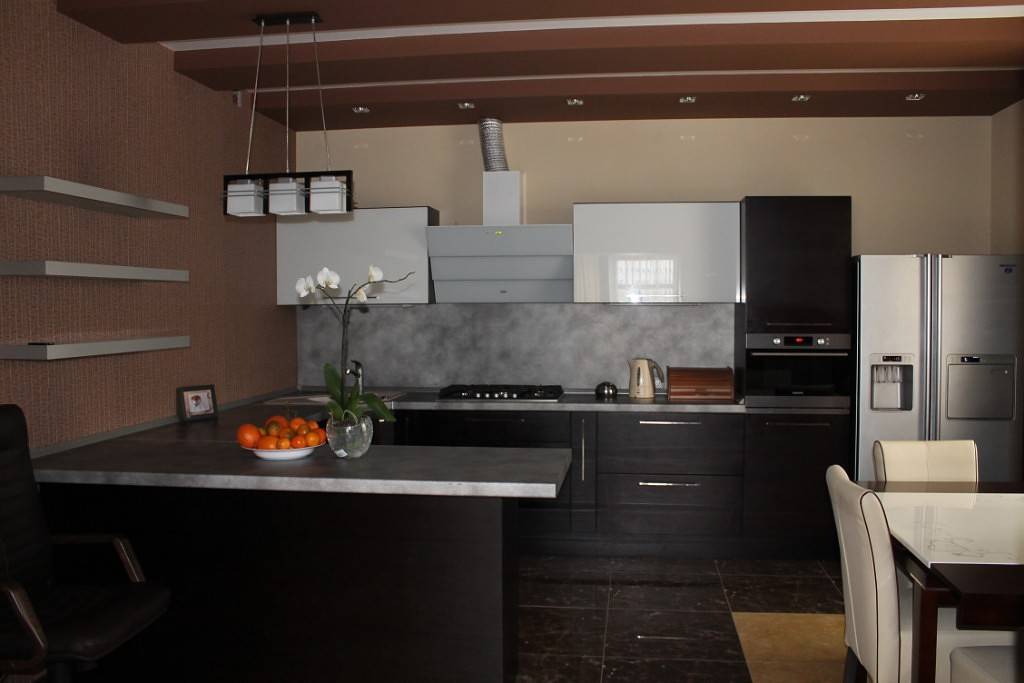 Еще один вариант — «светлый низ». Потолок и стены до середины могут быть темными, тогда как нижние фасады гарнитура, пол, стулья, стол подбираются светлых тонов. Это достаточно оригинальное решение, но воплощать в жизнь его следует лишь в больших просторных помещениях с высокими потолками. В противном случае, появится ощущение тесной «коробки» и замкнутого ограниченного пространства.