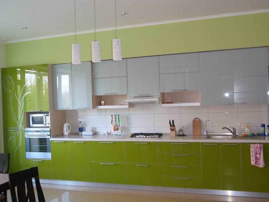 Яркая зеленая кухонная мебель может сочетаться с таким же ярко-желтым или фиолетовым фартуком (такой вариант подойдет для просторного помещения). Рабочий фартук может быть из глянцевого или матового белого кафеля с ярко-зеленой затиркой. Для деревенского стиля подойдет плитка с текстурой дерева в натуральных тонах. Допустима фотопечать на стеклянной панели, если фасады однотонные и матовые.