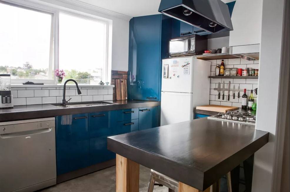 Сочетание синей мебели и серых стен — вариант для просторной кухни в современном стиле. Но такой интерьер обязательно требует яркого освещения. И не забудьте про тональность цвета — к холодному синему подходят такие же холодные оттенки серого.