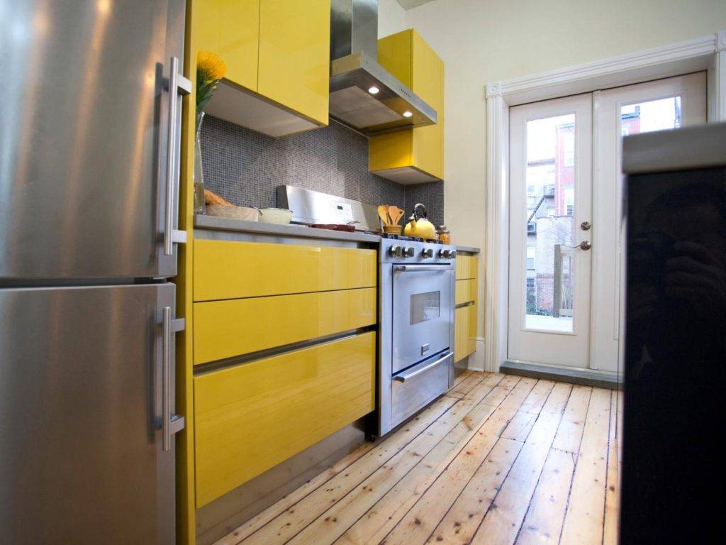 - Желтый цвет довольно практичен, поэтому им можно оформить рабочие зоны – фартук или столешницу. К тому же, желтый фартук визуально сделает маленькую или узкую кухню чуть шире.