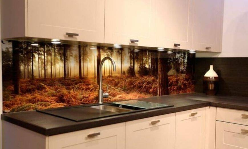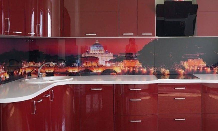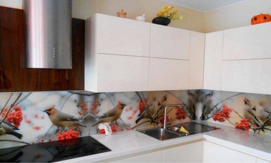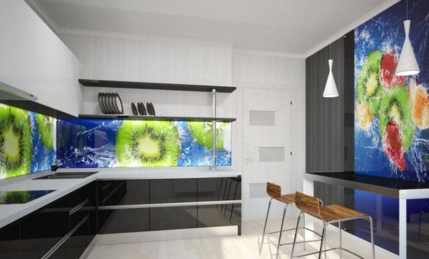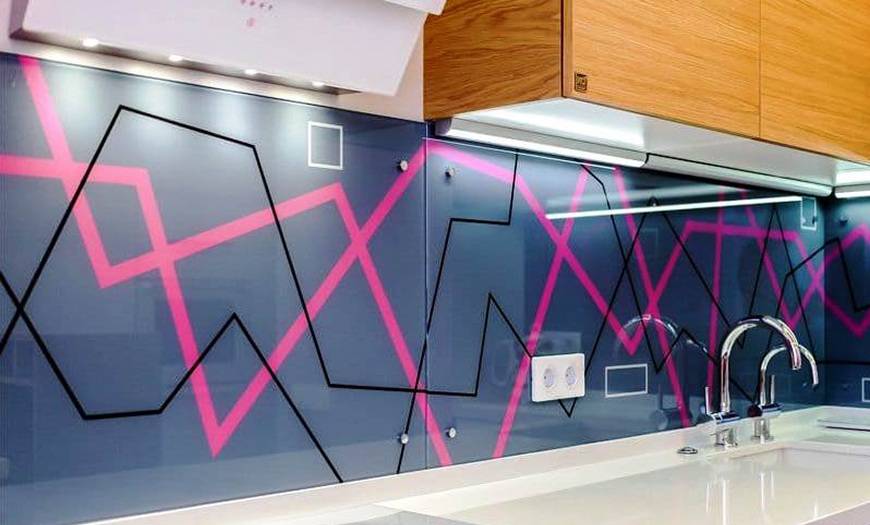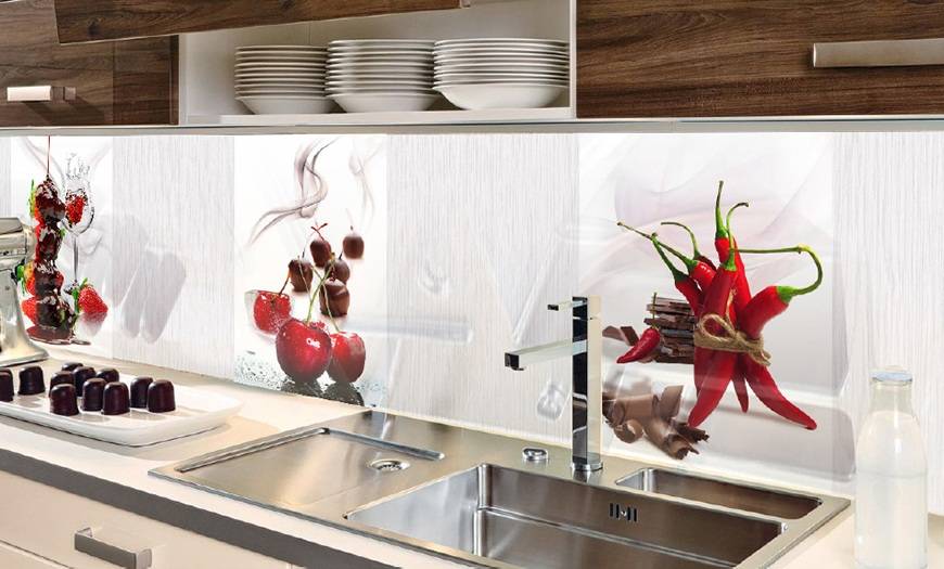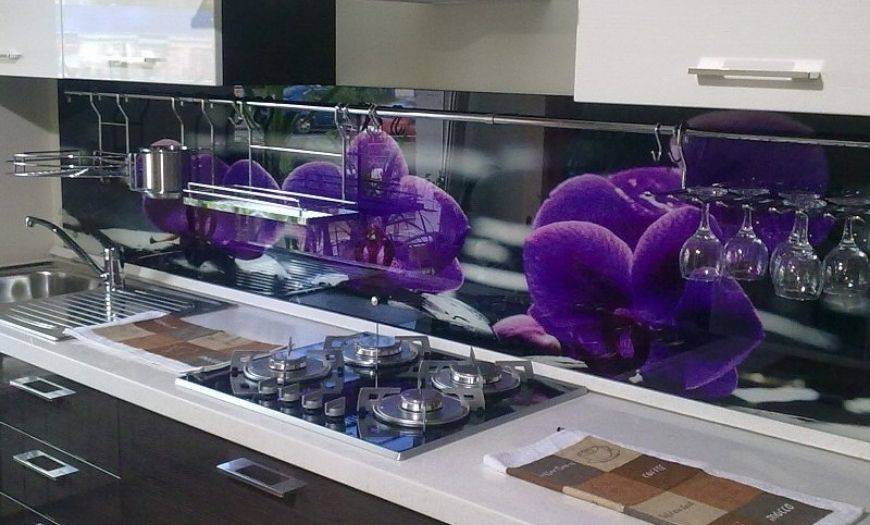 Стекло. Подойдут только закаленные и ударопрочные варианты, так как обычные листы слишком хрупкие и использовать их на кухне опасно. Такие решения выглядят стильно и современно, с обратной стороны может наноситься любой декор – от фотопечати до изображений, узоров и имитации разных материалов. При этом монтаж может вызвать затруднения, так как лучше всего использовать цельный кусок, а крепить его на стене непросто, услуги специалистов обойдутся недешево.