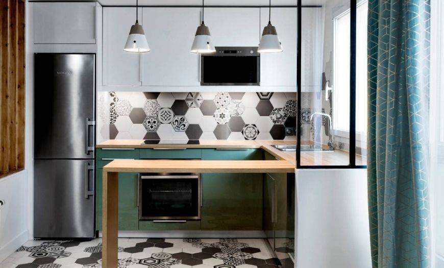 Фартук на кухне часто выкладывают плиткой с абстрактным геометрическим узором. Необходимо так подобрать рисунок, чтобы облицовка не выглядела перегруженной. Цвет выбирают с учетом оттенка мебели и прочей отделки.