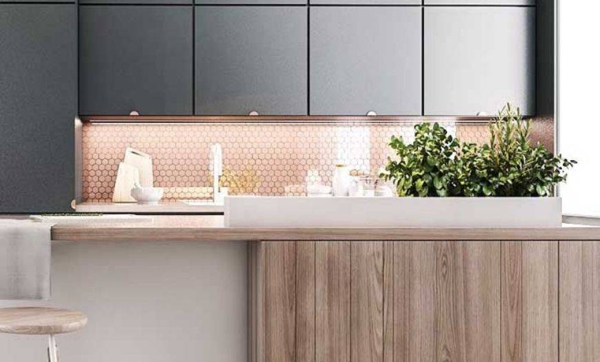 Также при определении размера нужно учитывать параметры отделочных материалов. Лучше, если элементы будут цельными, внешний вид от этого улучшится. Фартук может заходить под столешницу и шкафчики, чтобы максимально защищать поверхность.