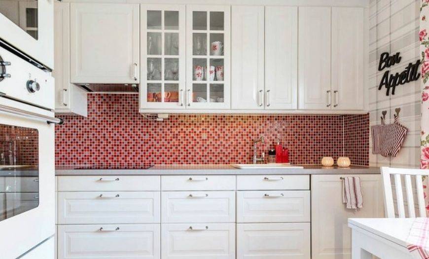 Мозаика. Необычное решение, которое продают в виде небольших элементов, закрепленных на основе из стеклоткани, что сильно упрощает монтаж. Но все равно укладка достаточно сложна, так как вначале надо ровно закрепить элементы на поверхности, а потом заделать значительное количество швов. Именно на затирку уходит больше всего времени, так как сделать ее нужно идеально. В целом, вариант смотрится стильно и подходит для большинства кухонь.