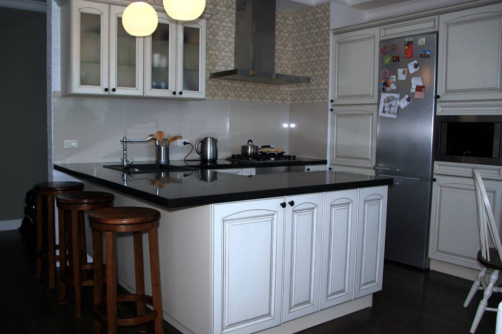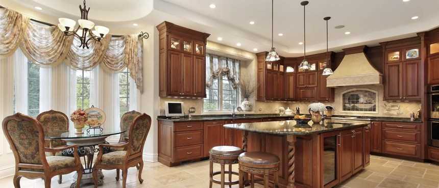 Такая кухня ставится на века, выглядит достойно и радует своих хозяев долговечностью. Интерьер вокруг создан в соответствующем стиле, предполагая большие удобные диваны в гостиной зоне и уютные обеденные столы в окружении стульев.