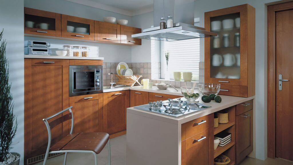Существуют разные компоновки кухонь, они бывают угловые, прямые, п-образные, по обеим сторонам стен, а также прямые кухни, совмещенные с обособленной зоной по центру, они и называются островными.