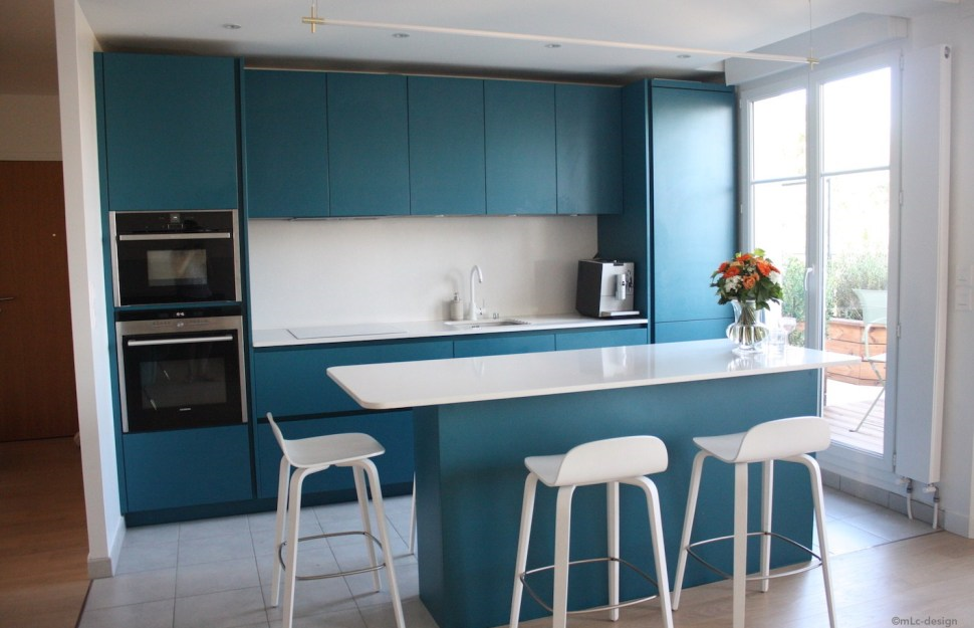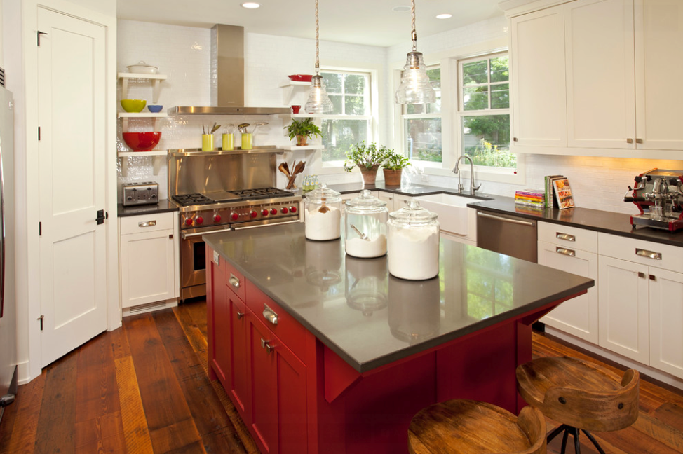 Всегда интересно сыграть на контрасте. Установите центральный остров яркого, насыщенного цвета: красного, бирюзового, синего. Этот дизайнерский прием оживит стандартный, нейтральный по цвету интерьер.
