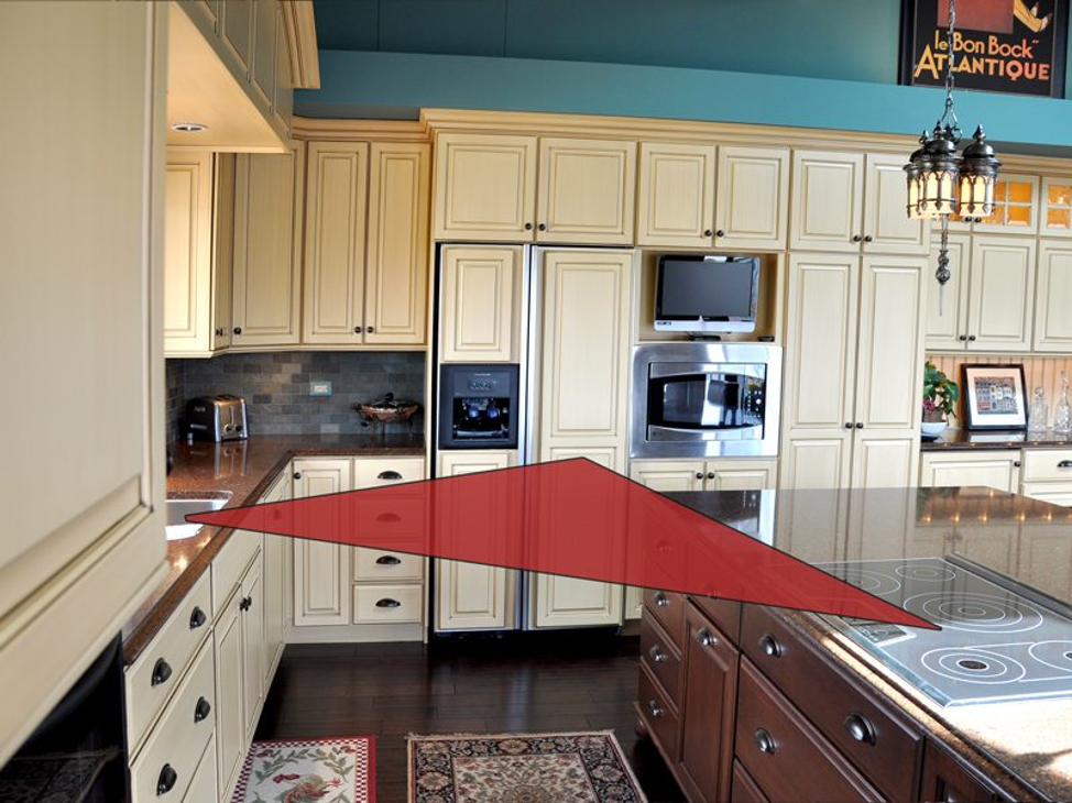Обустраивая кухню с островом проследите, чтобы линии рабочей зоны, соединяющие три центра активности человека, готовящего еду это плита, раковина, холодильник, создавали треугольник. Длина каждой стороны должна быть не менее 120 и не более 270 см. Для больших кухонь, при линейной планировке, эти условия соблюсти невозможно.