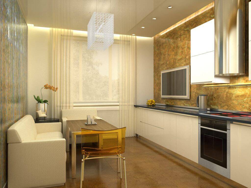 Если комната длинная и узкая, однорядная планировка станет лучшим вариантом. В этом случае кухонный гарнитур занимает только одну стену, а у противоположной устраивается обеденная зона. Для большего комфорта можно добавить небольшой диванчик — площадь 11-метровой кухни это позволяет.